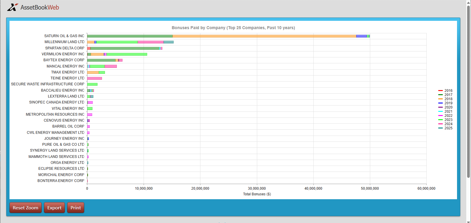 Cumulative bonuses paid by company, year, and area quickly show who is bidding aggressively and where capital is actually flowing. It becomes a practical proxy for market appetite that is grounded in evidence rather than conversation. Interactivity makes it easy to hone in on recent years or perform historical analysis on older years.