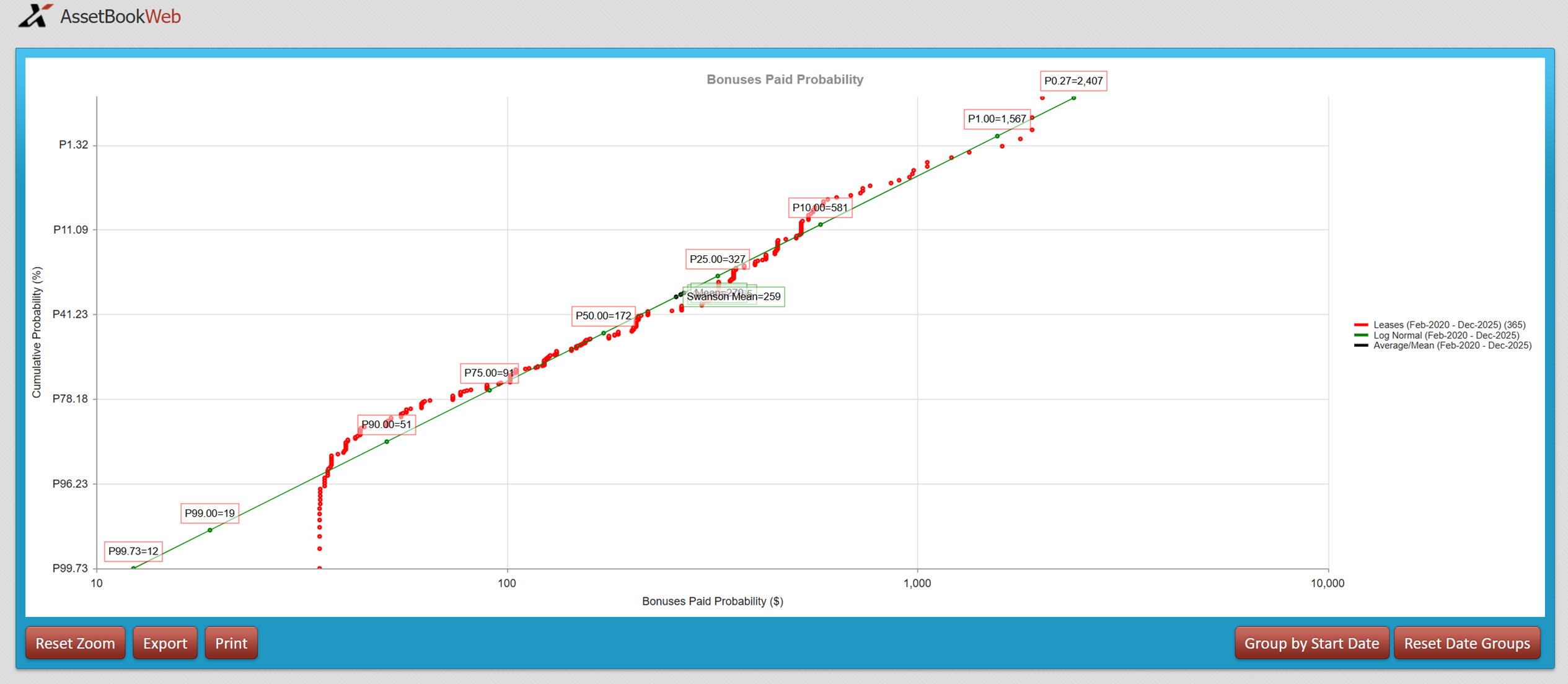 Instead of rebuilding views or guessing what exists, land teams have access to a consistent set of ready-made views that answer the questions they get asked every week. The value is not novelty; it is consistency and defensibility. Statistical analysis can be done with spreadsheets but having a ready-made template allows for better decision making. The graph below shows bonuses ($/ha) paid and the associated averages and probabilities (P10, P50, P90 etc.)