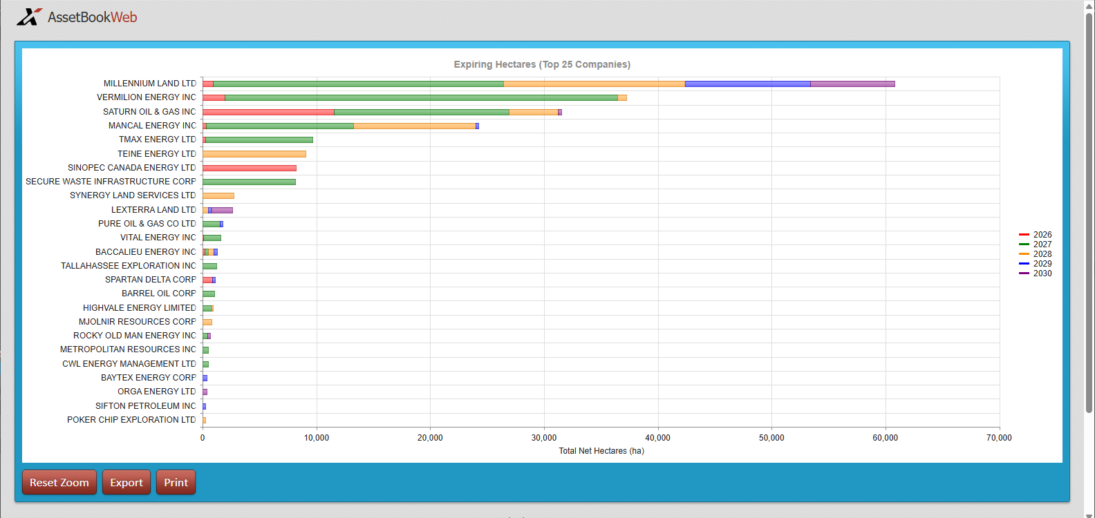 Near-term lease expiries and undeveloped hectares can be surfaced and viewed spatially, which reveals clusters and timing issues, early enough to act. Farm-ins, swaps, extensions, and competitive bids don’t need to be last-minute exercises when you have the information presented properly.  The graph below shows the amount of land that each company in the area that is expiring over the next several years and could be a good opportunity for a farm-in.